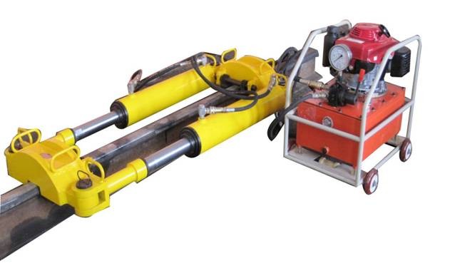 b.把夾座分別放在兩根鋼軌上,插入楔鐵,安放油缸、活塞桿組件,使油缸一端放在有連接魚尾板的鋼軌上。
